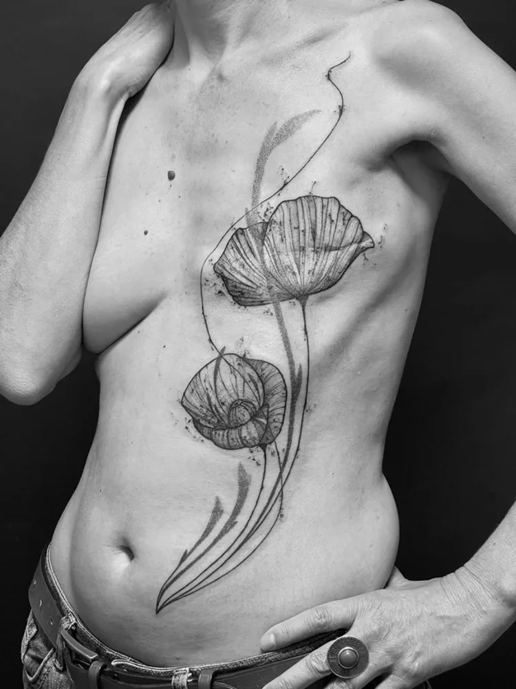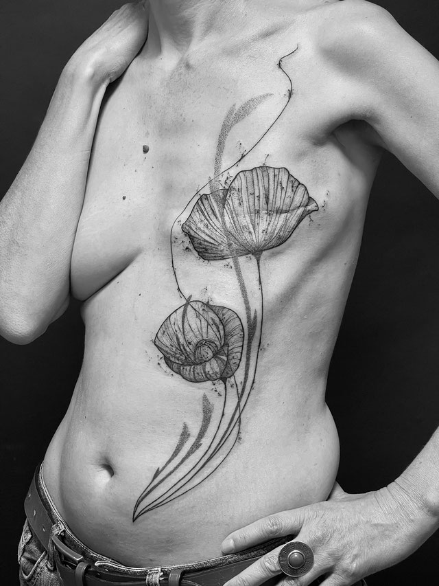 Au sommet de l'hôtel Radisson Blue de Bordeaux, un groupe de femmes de tous âges discute autour d’une table basse couverte de prospectus. L’association Sœur d’encre propose, ce week-end là, l’événement Rose Tattoo. Des tatoueuses de toute la Gironde recouvrent gratuitement les cicatrices de femmes ayant subies une mastectomie. Tous les corps défilent sous leurs aiguilles. Des femmes aux torses plats, asymétriques, amazones ou refaits. Tous arborent des bouquets de fleurs noires et blanches. Pour Jeanne*, la décision de ne pas se faire reconstruire la poitrine découle de cette nouvelle possibilité de sublimer ses cicatrices. “Le tatouage change le regard des gens et ce que je perçois dans leur regard, ils ne s’attardent plus sur mon absence de poitrine, mais sur mon tatouage.”