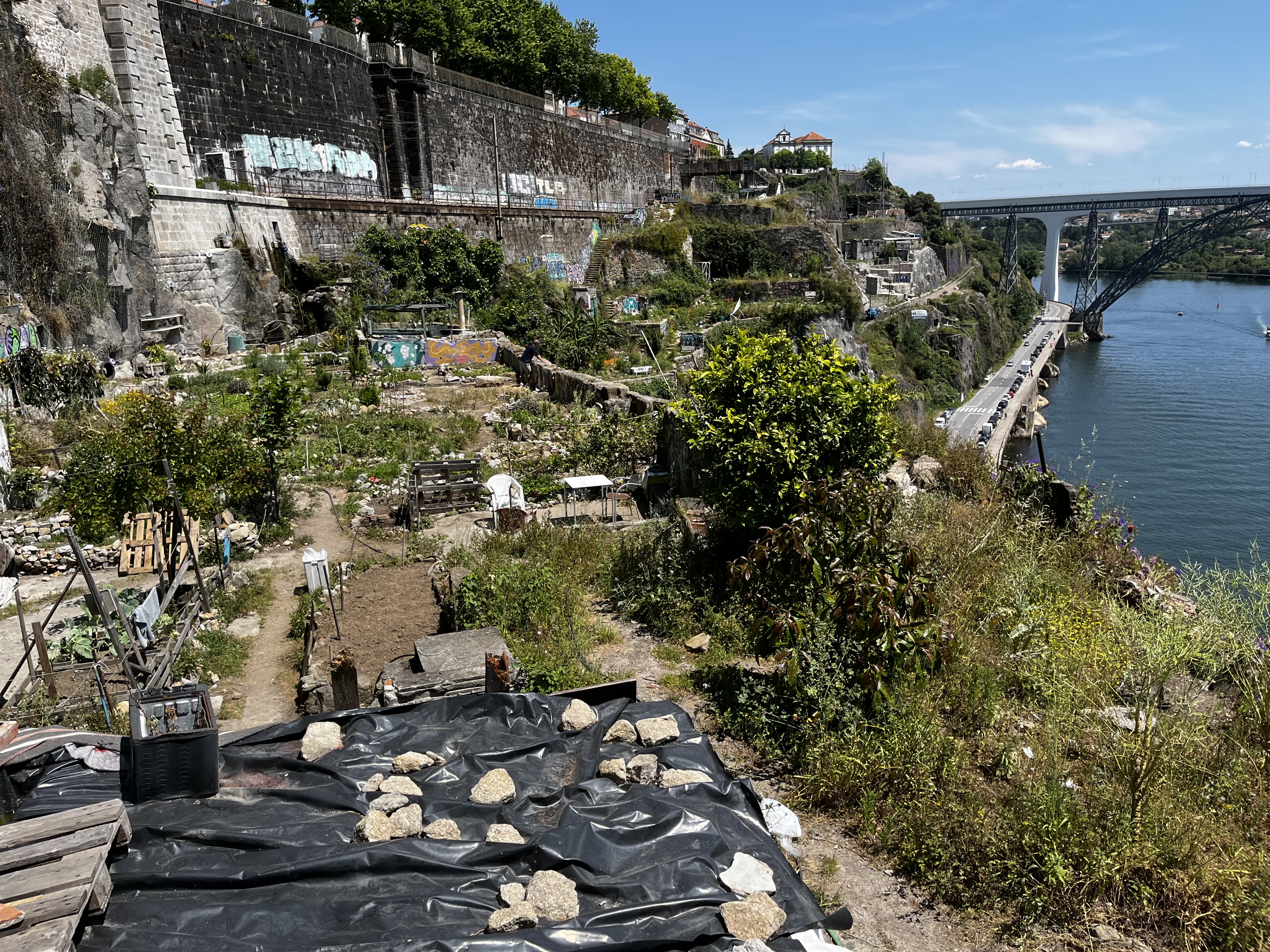 À Bonfim comme ailleurs, les habitant·es investissent les espaces délaissés. Aux pieds de l’immense pont Infante Dom Henrique, des jardins partagés ont envahi les flancs de la colline qui surplombe le Douro et les ruines des anciens bâtiments qui y étaient accrochés. Au milieu des nombreuses plantes qui sortent de cette terre argileuse, les outils des jardinier·ères improvisé·es côtoient les quelques tentes de sans abris.