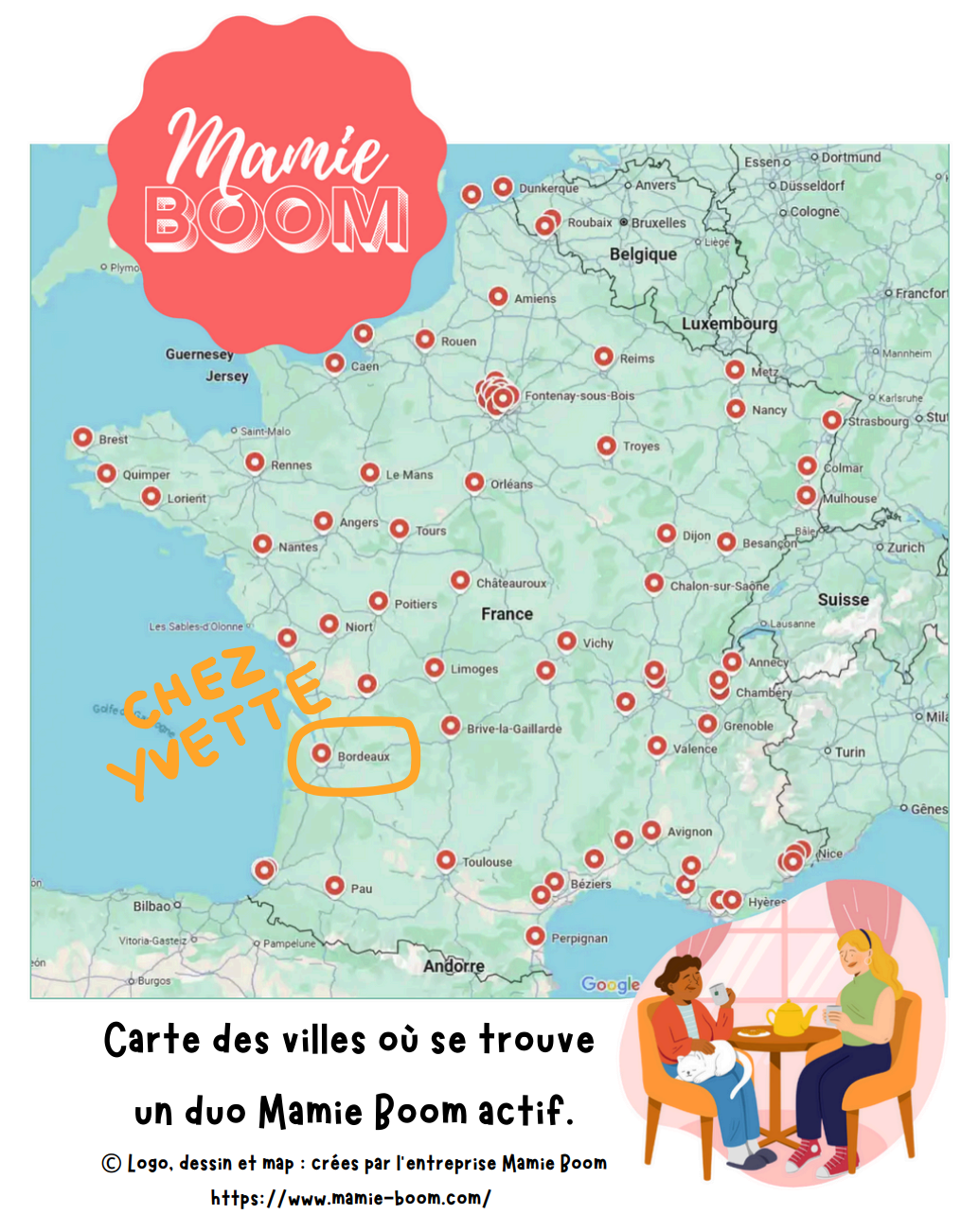 Nos deux bordelaises font partie des 150 binômes Mamie Boom actifs à travers plus de 100 villes en France. Chaque mois, tous les duos passent en moyenne seize heures ensemble à un rythme de deux fois deux heures par semaine. Six ans après sa création, l’entreprise Mamie Boom communique : 55 000 heures de visite ont été effectuées depuis sa création.
