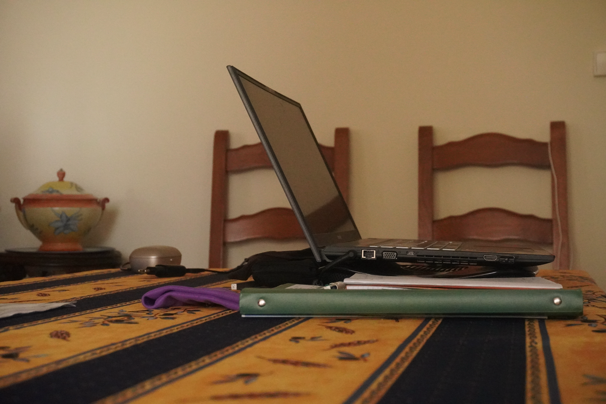 © L'ordinateur ouvert d'Yvette tronne sur la table de la salle à manger : elle poursuit l’informatique de façon récréative.