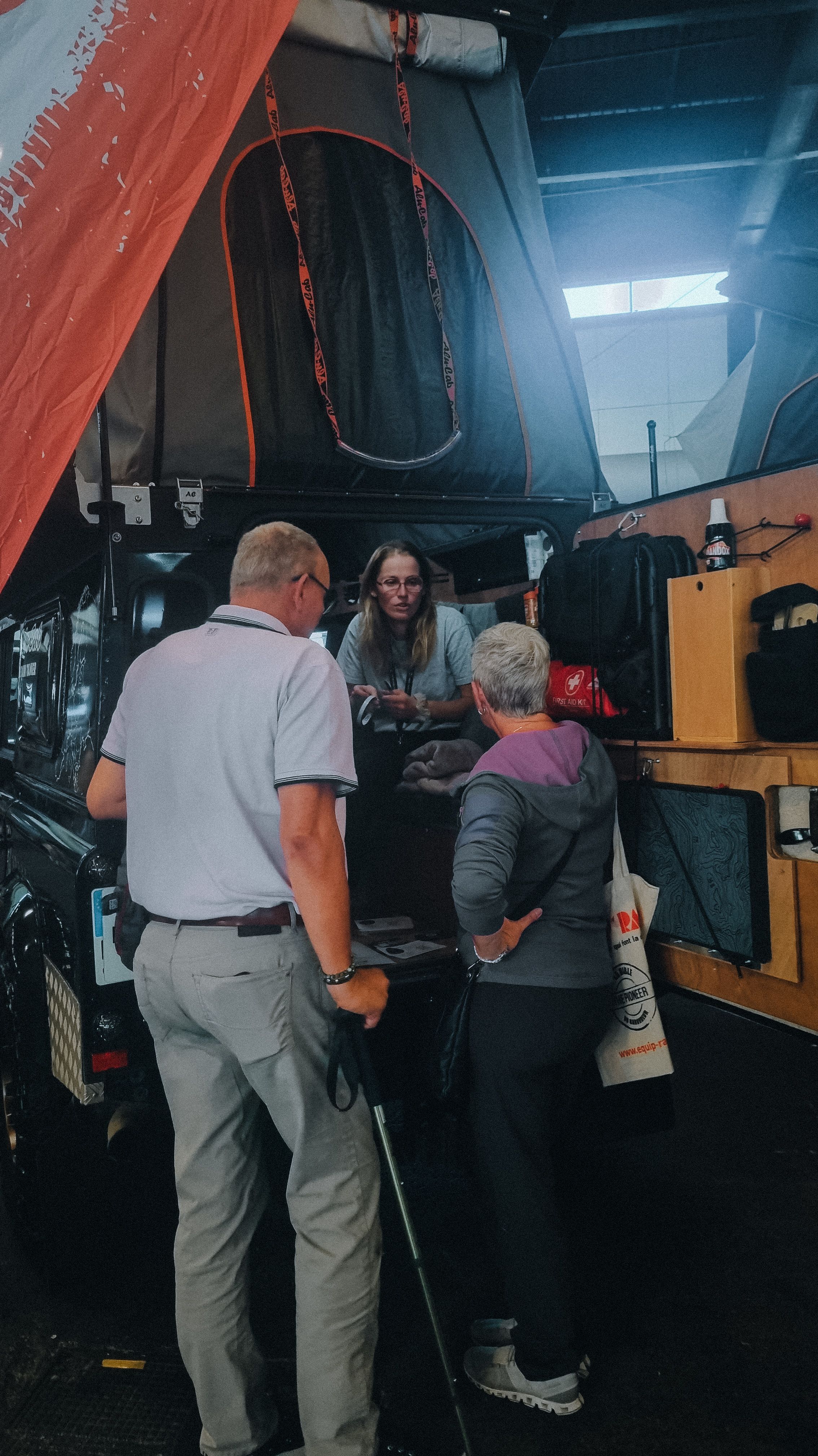 Avec leur van transporteur 6.1, Cécile Collet et son mari fuient leurs enfants. Du moins, c’est ce qu’elle confie sur le ton de la plaisanterie. Le couple franco-polonais se rend à l’exposition pour faire un repérage de matériel : remplacer leurs fenêtres, acheter des platines pour faire tourner les sièges et optimiser l’espace de leur van. En moyenne, ils y dorment une cinquantaine de nuits à l’année.